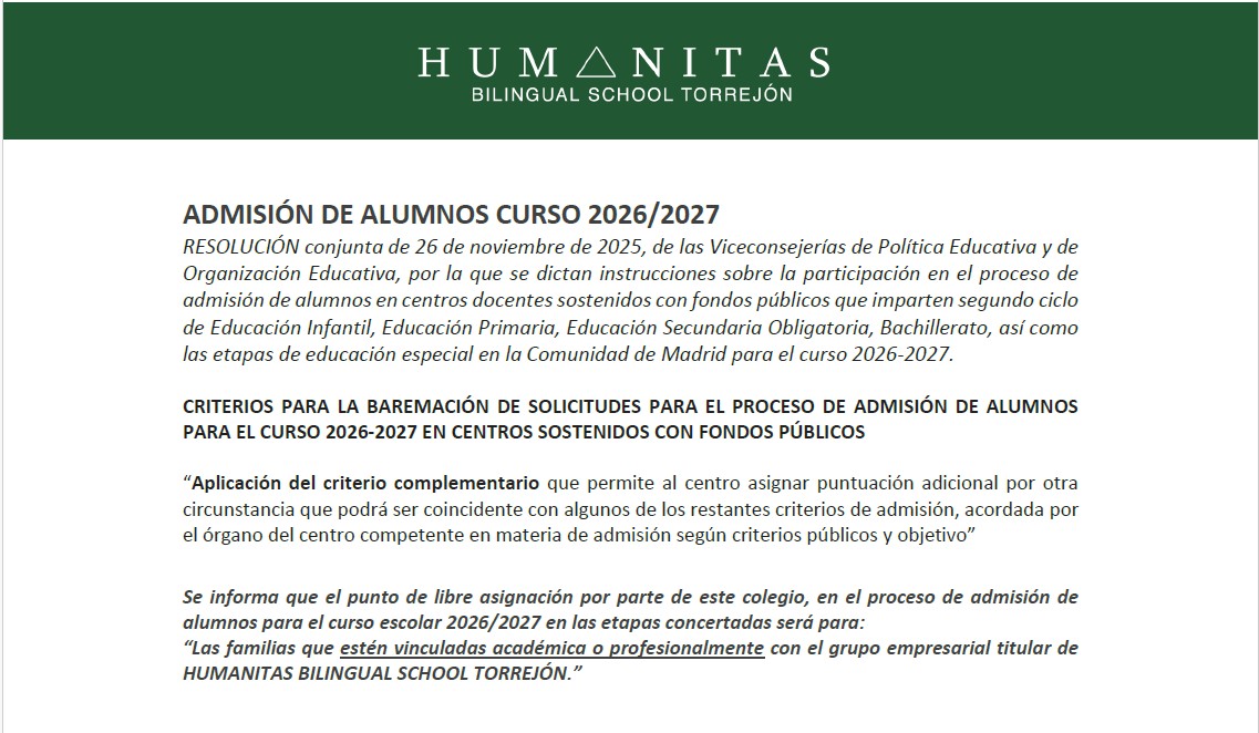 La Consejería de Educación de la Comunidad de Madrid ha publicado el calendario de admisión de alumnos para el curso 2026-2027. El plazo para entregar las solicitudes es del 11 al 25 de marzo de 2026. Este proceso sólo afecta a nuevos alumnos/as: si su hijo/a ya se encuentra matriculado/a en el Colegio, la renovación de plaza es automática.